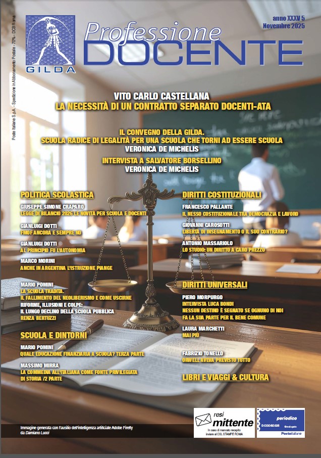 Parliamo di legalità in Gilda tanto che a questo argomento è stato dedicato il tradizionale convegno del 5 ottobre, nella giornata mondiale dell’insegnante., Scuola, radice di legalità. Per una scuola che torni ad essere scuola il titolo diversi i relatori, tra cui Salvatore Borsellino, fratello di Paolo, magistrato ucciso dalla mafia, intervistato da Veronica De Michelis, a pag.23, a pag. 4 il resoconto del convegno sempre a cura di De Michelis.